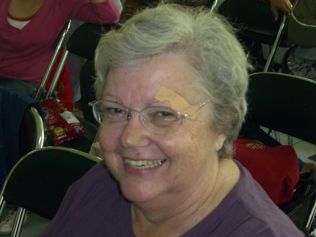 As we got back to the main area, we had a little trouble finding just which way we needed to go. When we finally were close to where the group was gathered for games, disaster almost struck. I was about 10 feet in front of Mary as we walked down the last path to the steps when a rock she was stepping on twisted and she basically fell flat on her face. She hit the rocks, cut her head just above her left eye, twisted her glasses, hit her chin and skinned her left knee. People came from everywhere – especially from our group to help her. All she really wanted to do was catch her breath so she asked them not to try to pick her up. She was really bleeding – she remarked that head wounds always bleed a lot – but a lot of tissue and some water soon cleaned it enough that they could put on a coagulate – they came with a fully prepared first-aid kit and someone who knew how to use it – and a band-aid and the bleeding stopped. After she had caught her breath we got her up – not an easy task because she could not get her knees under herself and walked her back to the meeting room. I gave her a couple of Aleve and she sat and recovered. I think she was more embarassed than anything else.