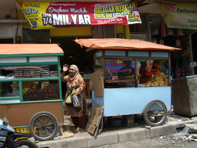 Elder Christensen loved this because he raised sheep – a load of sheep tied in a pick-up. Driving through a city on the way to Bogor we saw this lady buying dates for breaking the fast and when she saw us she grinned and waved. The people are almost always friendly here. When we stopped to buy a chili shaped door knocker – picture to come – we saw these young ladies playing a board game and it turned out to be Monopoly. They were happy to pose for their picture. The young woman sleeping between her parents as they waited for the light to change is a classic. I guess if you grow up riding on a motorcycle, it becomes part of what you do and it gets boring.