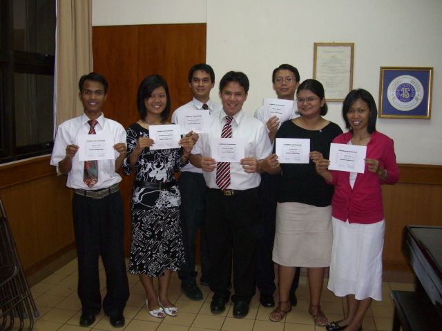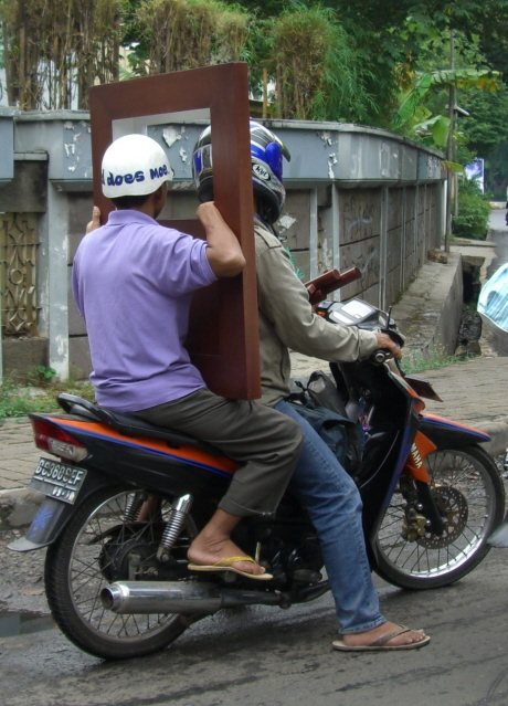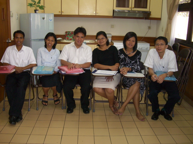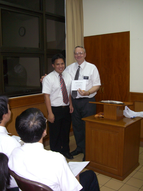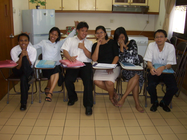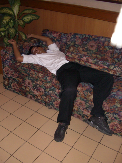 I love this motorcycle shot. I call it ‘Indonesian Limo’ because of the partition between the driver and the passenger. The hole is so the passenger can tell the driver where to go, etc. The next picture is me with Edward Jung, a branch president in Korea. Over the next 7 months, I should get to know him better. We really do keep Sam busy. Here he is collapsed on the couch in the foyer when he should be in class.