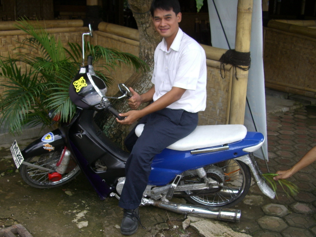 When we stopped at the restaurant, there was this chopped down scooter sitting next to the door. Sam decided to climb on for a picture. On the right hand side you can see an arm reaching for a green branch that is stuck in the fender. This is what they do when a vehicle has broken down. It lets folks know that it is not going to move anytime soon so they might as well go around. It is like us putting out reflective triangles or flares.