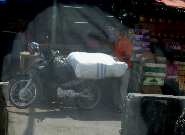 These are two pictures of the load that was so heavy it lifted the front wheel off the ground. Unfortunately the best shot of that has my reflection blurring it. The clear shot shows the load – notice the black bag between the seat and the front wheel. We could not figure where the driver was going to sit and we were past it before he got on. The load is a good 4 feet wide so it overhangs each side about 2 feet.