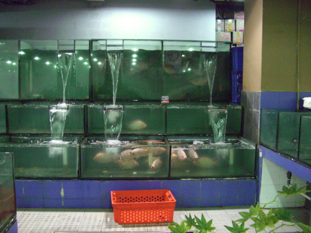 Another version of Go Fish, only this time it is at the grocery store where you get to choose the fish you want for dinner and the butchers catch it and prepare it while you wait. Usually most of the tanks are full but it seems that fish was a popular choice today so only a couple of tanks were in use.