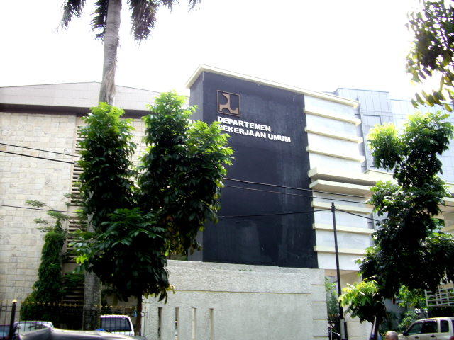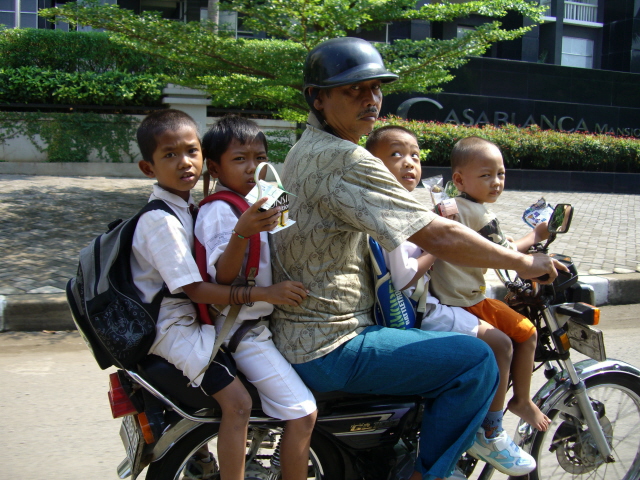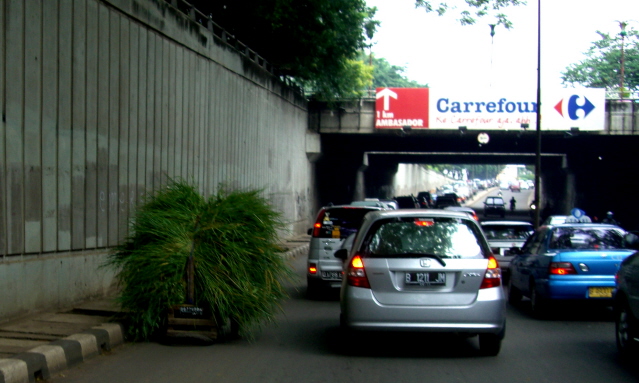 A precious load -notice that there is only one helmet and it is only a liner. The next picture shows a load of grass much like the one that beat us through the traffic a couple of weeks ago. It is on a cart with one man up front who runs down one side of the underpass to get momentum and then tries to keep it going up the other. The last picture is one Mary has been trying to get for a long time so Bob could see it. It is the Jakarta version of the Department of Public Works.