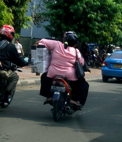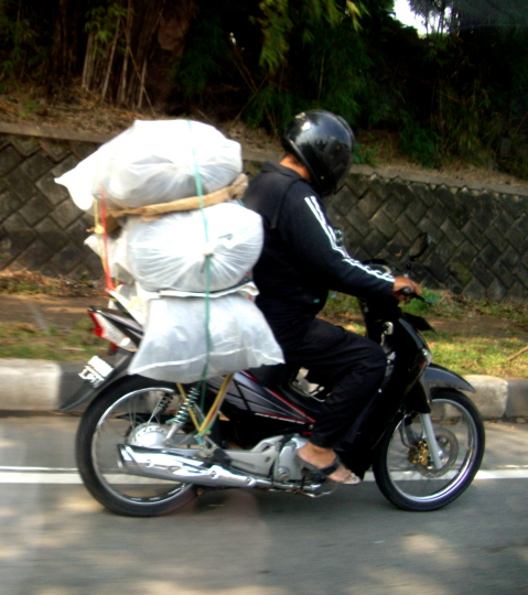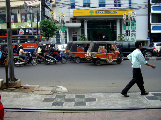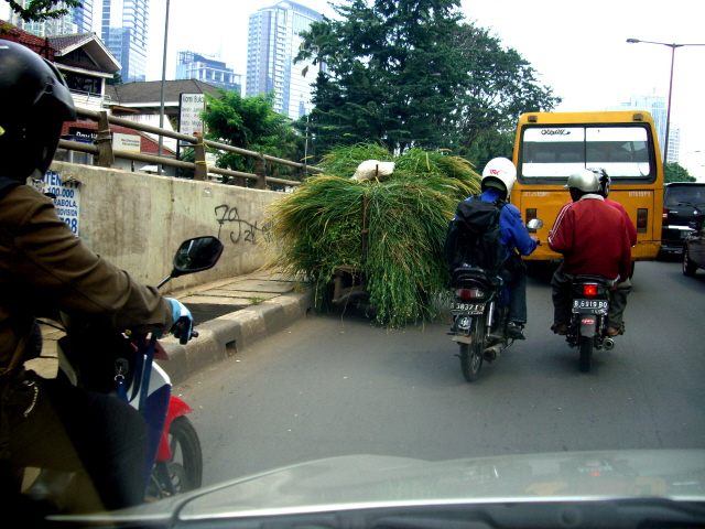 Mary at a JCo donut shop. The owner basically took Krispy Kreme’s idea and made it better. In just 2 1/2 years they have opened over 20 shops in Indonesia and have expanded to Malaysia. Since one donut costs as much as an excellent street meal, they are not for the average Indonesian. Bajajs are a step up from riding the Angkots or small buses. Most of the run on a small two stroke engine and are great polluters. They are trying to retire these and replace them with ones that run on LPG which is cheaper and much cleaner. This is a main street of Jakarta and that is a large load of grass being pulled by one man. This is just one of the reasons the traffic is so bad in Jakarta. The grass will be used to feed goats or sheep.