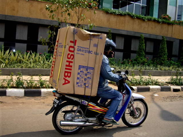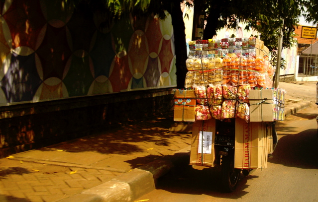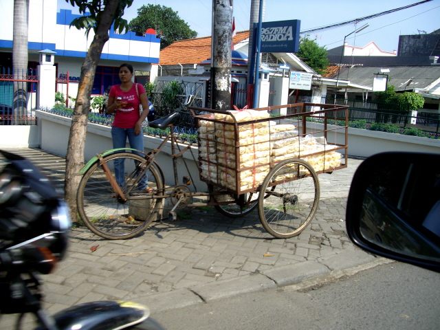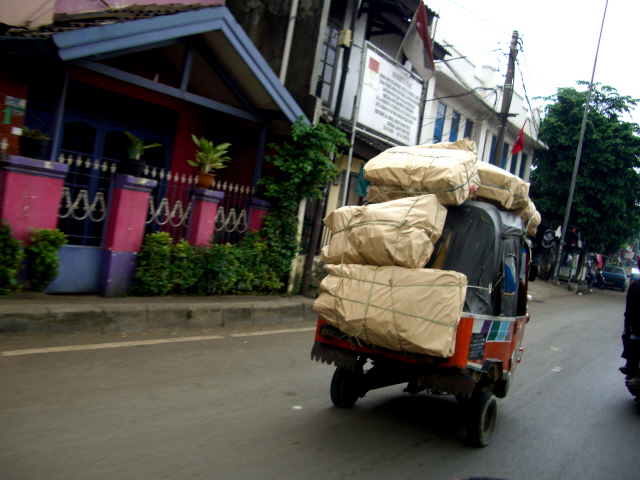 The loaded Bajaj is not a common site in Jakarta. This one shows real planning in placing and securing the load. The large white building was at the end of the parking lot for the gem market but is not part of it. It is so Jakarta – it seems to me to be kind of cobbled together without much planning. As if the builders kept thinking of something else they needed a space for and added it on. Or perhaps a section got done and they ran out of money for a while and by the time they had more they had a new idea of what they wanted.