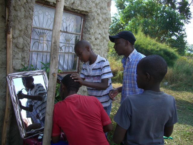 July 4th might have been Indepedance Day for the US but in Port Durnford it was Engagement Day for James Machaka – the president of the Port Durnford Branch. He is the tall handsome man on the left in the first picture. We did not get a picture of the bride to be because by the time we had to leave she was not dressed for the occasion. The next picture is sister Joyce and friend. The party was held at her home – she was acting like the mother of groom. The guests are shown waiting in the tent for the program to start. I had to show one of the men getting a haircut and shave so he would look good for the party. The clippers kept stopping and a substitute pair did no better. It seemed for a while that he would have a very unusual hair style for the day but they finally got a pair that allowed him to complete the job.