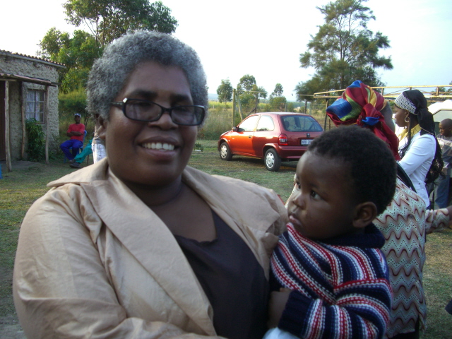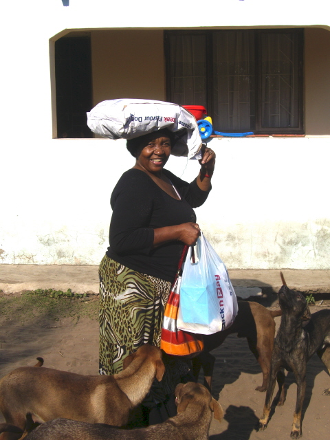 Last week we were on our way to teach English at the Nzama home when we came upon Gogo Nzama carrying her latest purchases home. We of course picked her up and took her to her homestead. The sack on her head is a large bag of dog food – she is holding on to it because the dogs were jumping against her because they know what it is.