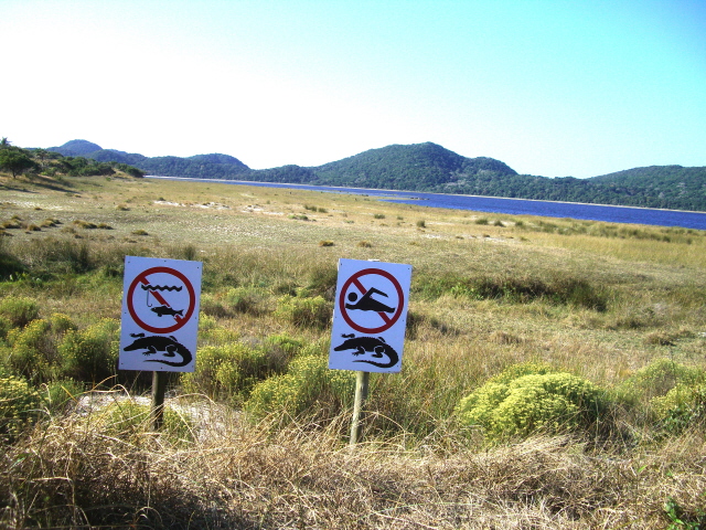 On our second visit we took the road to Cape Vidal and along the way we came across 2 large cape buffalos who let me get closer than I probably should have been and posed for me. The picture of the bay with what looks like a pile of rocks along the shore is actually one of a herd of hippos resting in the shallows. At another stop along the way there was a shallow pond that was the happy resting place for another herd of hippos – these we could get much closer to. I would have gotten closer except for signs such as this:
