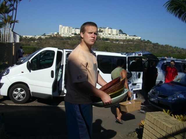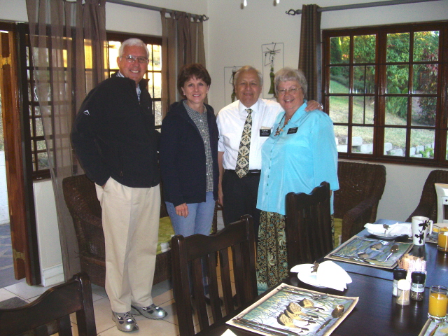 Slept well but again woke too early. We got busy and packed our bags and I took most things out to the car before we ate breakfast.  Since we needed to be at the Pinetown chapel by 8:00 we asked to have breakfast earlier then yesterday. The owner – Bronwyn – was more than accommodating and we all enjoyed another nice breakfast together. We had our picture taken with the Wells – they were leaving for Swaziland today – and then hurried off to the conference.