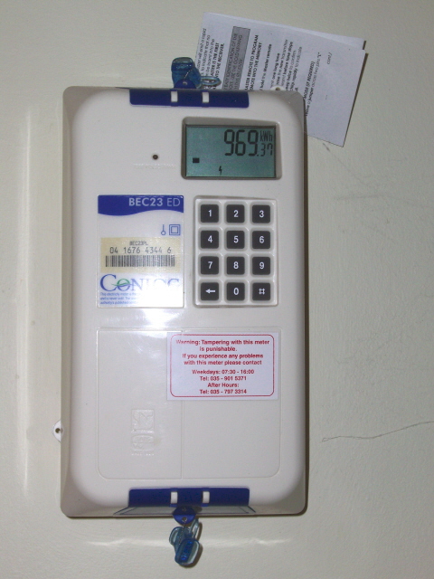 On the right is our trusty meter. If it goes to 0 everything electrical stops. So we buy electricity at about 10 cents a kilowat and we use about 400 KW per month. At current exchange rates that is about $50 a month which is pretty good for home but high for the average African home. The center picture is a wall plug. Note the three round holes where we would have one round and two slits – but it basically works the same. The big difference is the switches above the plugs. Every wall plug has one and it turns the plug on or off. At first it is hard to remember that you can turn an appliance on or off with the switch but later you find that it is often easier. The last picture is a bayonet light bulb. They have both bayonet and screw in light sockets here so often you have to have both kinds in the cabinet to make sure you have the right kind when a bulb burns out. End of short lesson…