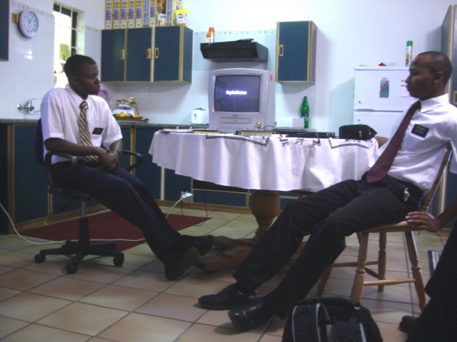 On our way to DDM this morning we passed this beautiful bougainvillea tree in full bloom. This is one of the things that South Africa has with Indonesia. Everywhere we go we see bougainvillea. At DDM, Elder Babeeyo on left conducted as District Leader. Elder Mbithi gave a short lesson on taking the right member with you when you teach a lesson. Before DDM I taped two of elder Musemare’s fingers together to see if this will help the one he closed in a car door 9 weeks ago heal. I also gave him some pills that were sent up by Sister Mann. If this does not work he gets to have the finger X-rayed again.
