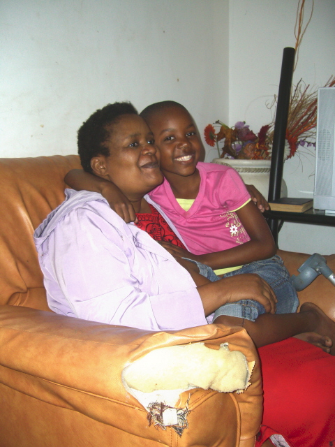Guess who wants to be a professional soccer player. Mary and Sister Mbambo in front of her house. Sister Tembe and daughter in their living room which is about 8 feet by 8 feet. The furniture might be torn but love abounds in this home.