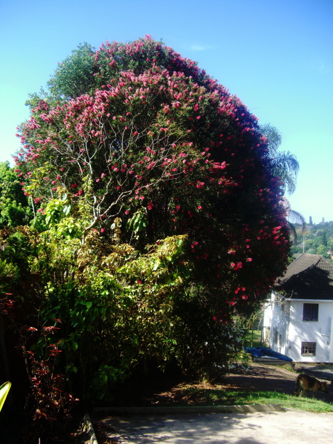 This morning I took these pictures of the huge pink bottle bush and the unusual tree that sits right off the patio at Crystal Stream Manor. It was a beautiful morning until about 8 a.m. and then a coastal layer of fog seemed to roll in.