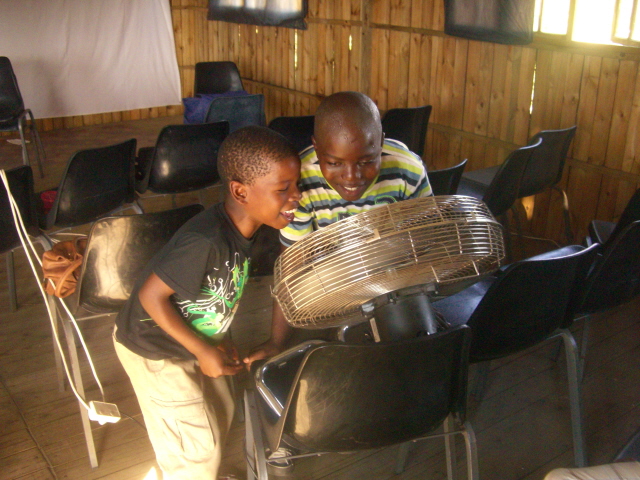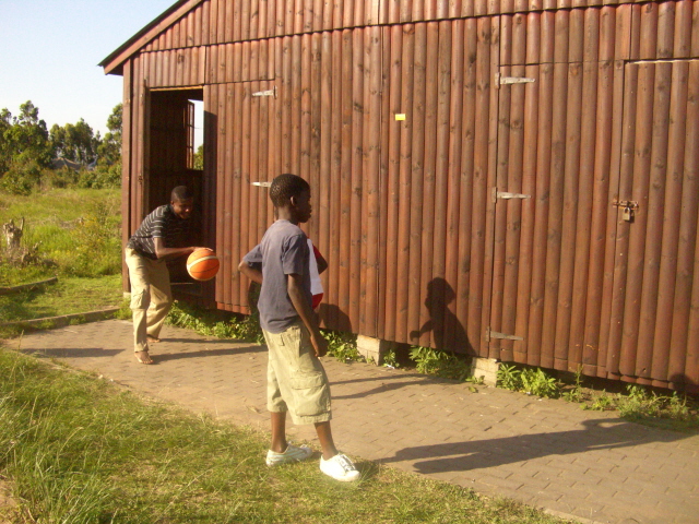 After the movie I went into the chapel and found these two young men singing into the fan. The blast of air made their voices sound strange. I have a video that captures the sound and the smiles on their faces. Two man – young men – basket ball without goals and a very small court. Elder Wengert, Ayando Madondo, and Zehile’s little sister.