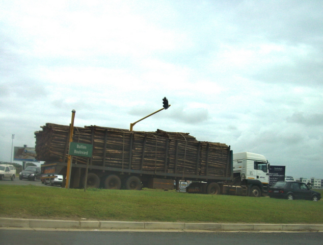 The Khanyile family would be a wonderful addition to the PD branch. Zinhle, the oldest child, comes to church and youth when the parents allow. The mother use to come to the English classes at the Nzamas. A neighboring child really wanted to be in the family portrait. We promised to take his picture if he would step out of the family shot. As I have mentioned there are huge tree farms in the country. Everyday we see truck loads of logs heading for the mills but it is hard to get a picture. I was lucky to catch this large load as it went around a corner.