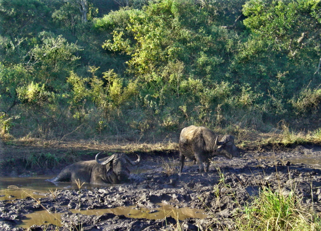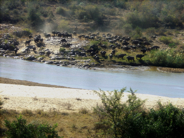 We saw two Cape buffalo enjoying a relaxing mud bath. A herd of Cape buffalo at the river. And a group of zebras that were no where near any water but seemed to be happy being dry.