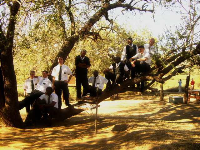 First of all you find all kinds of animals when you go to a game park in South Africa. For instance sometimes you find a whole group of elders ( A group of elders are called a Zone) resting in a tree. Elder Musisi wanted to make sure I did not miss his smiling face while Elder Reeves was jumping with joy or maybe he was doing some strange mating ritual.