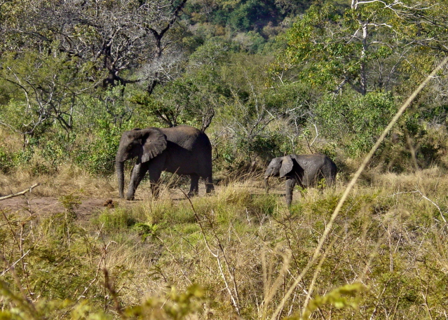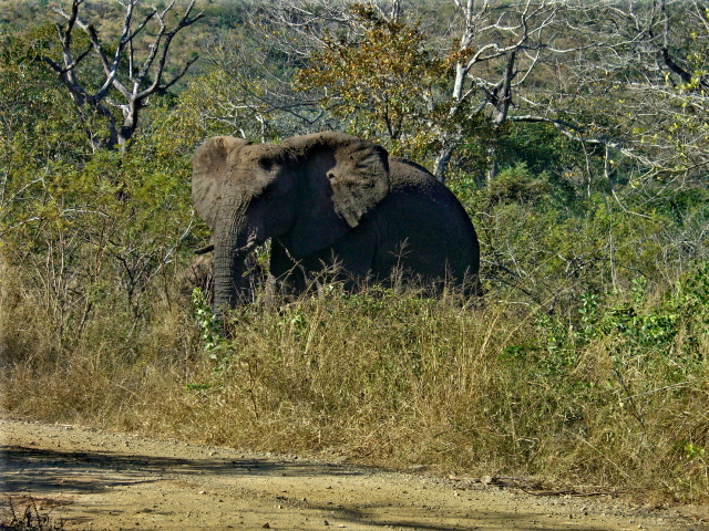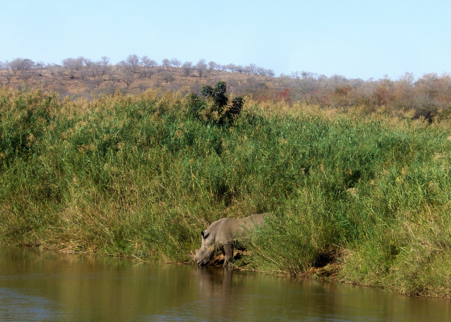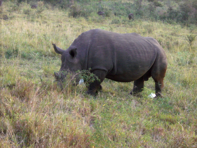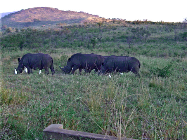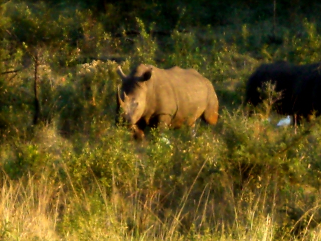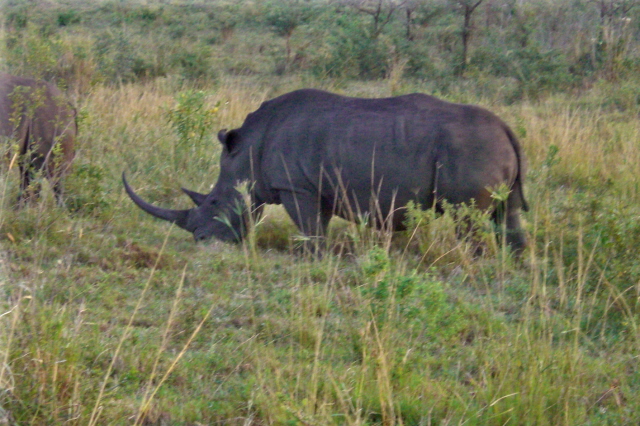 These big boys – or girls for all I know – came within 20 feet of the car. That is probably closer than it is wise to get to something that could probably go through the car without even slowing down. They certainly weigh more. Notice the really long horn on the one. A poacher would love to get a hold of that and since these were within a half mile of the fence to the park, it may just happen. They are losing 6 – 8 a year to poachers.