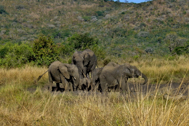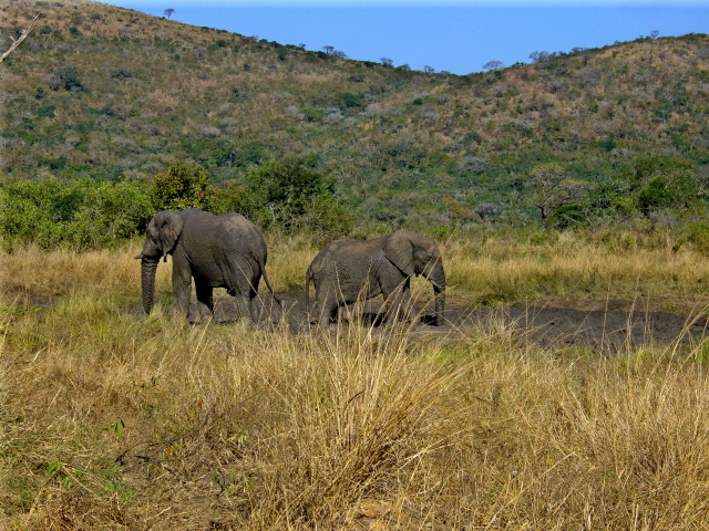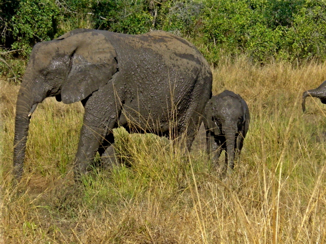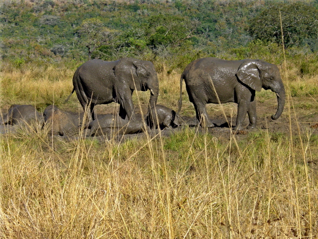 We had a wonderful time watching elephants at a mud hole – they seem to be able to crowd a lot of really big bodies into a fairly small mud hole. If you look closely at the middle picture you will notice that a couple of the elephants have their legs up like they are either going to take a bow or do a dance step. The last picture is either of a pair of bookends or two elephants who are about to have a duel…