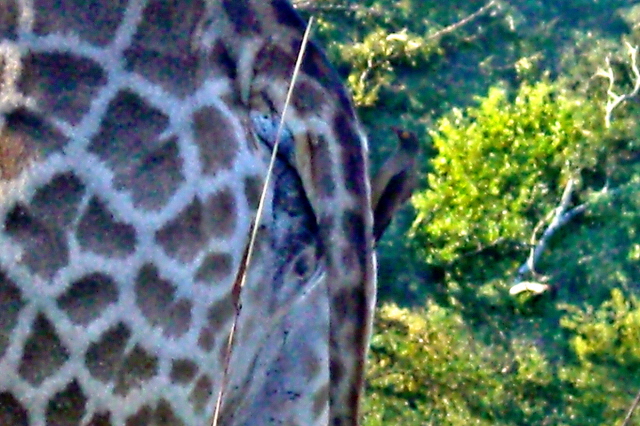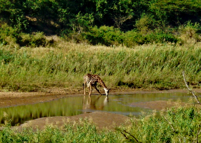 We saw a rhino drinking, a giraffe drinking, and an elephant that just finished drinking and was hurrying into the brush to ….