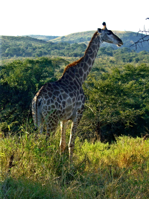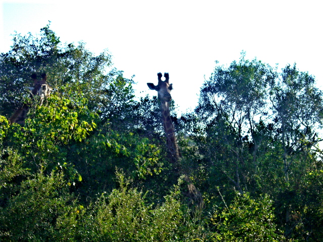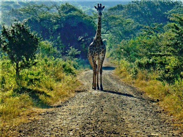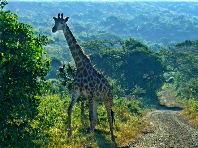 So Mary is mentioning that we have not seen any giraffes when we come over a rise and see this walking down the middle of the road towards us. Then we see them everywhere. Most of them are having dinner at the local trees. Some stop and look at us wondering why we do not let them eat in peace.