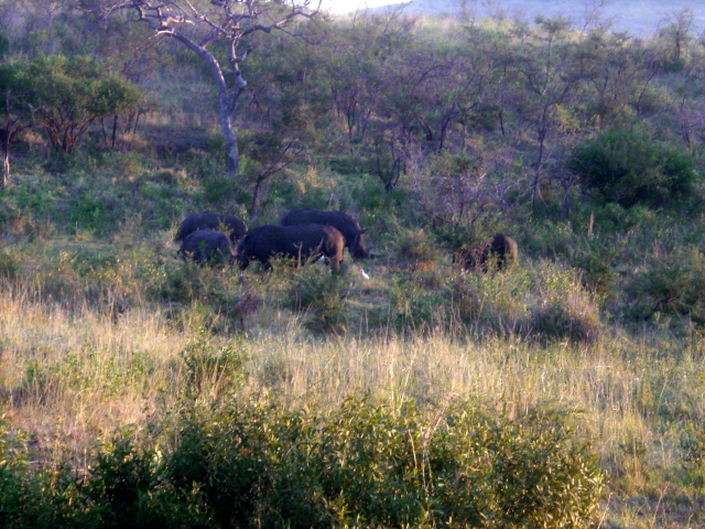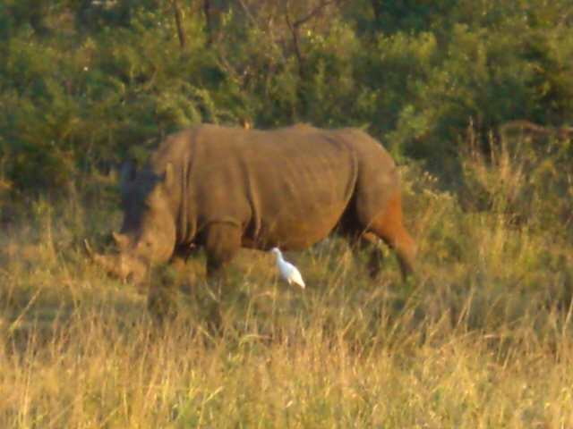 In answer to my complaint that we had not seen any rhinos this group of 6 wandered out of the brush. The setting sun turned this one almost golden tan. The birds do not clean off the rhinos. They follow the rhinos and eat the bugs that jump out of the way when the rhinos browse.