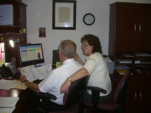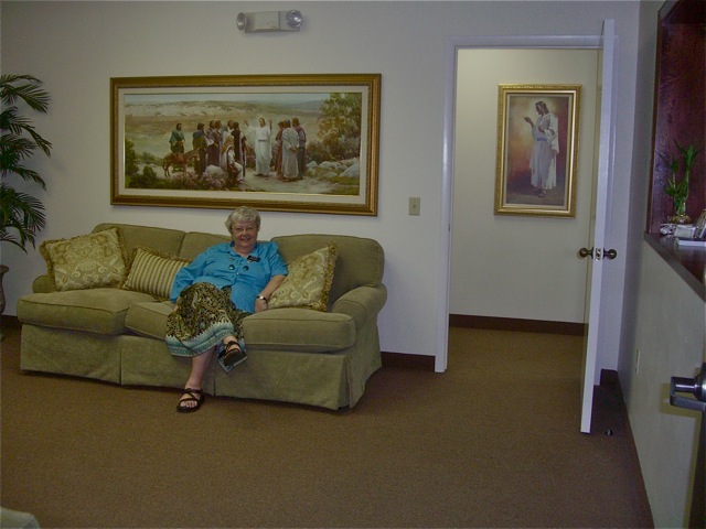 Until we get acquainted with the ward President Anderson has asked us to serve in, we are spending most of our day in the office. Mary is sitting in the receptions area. One of the couples we will serve with are the Beagleys from Montana. They came with their 5th wheeler and spent the first part of their mission down in the Keys but are now keeping the cars, telephones and records in order.