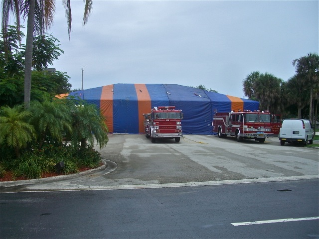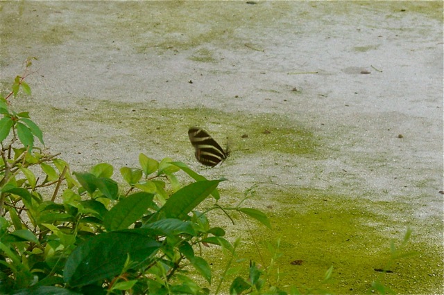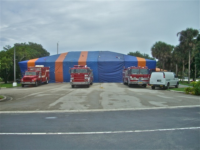 When we drove home for lunch on Thursday we found that the fire station at the entrance to the complex was tented so it could be fumigated to kill the termites  – or so we guessed. As we were driving away after I took the pictures below, Mary asked “Where were the firemen?” A good question that I could not answer. Hopefully they did not leave them in the station! When we got back to the office on Friday, we saw this yellow striped butterfly flitting around near the van. I took 5 or 6 shots and got luck to get this one of it flying.