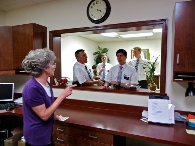 The APs. Elders Avila and Rippstein show off their new almost matching ties that we bought for them. We told them when they wear them they will always remember each other, the mission and us. Elder Rippstein is concentrating on getting the numbers of baptisms that are possible for this weekend. Friday was Zone Leaders Council and after it was over most of the ZLs came in. I took a number of pictures but this was the only one that was worth posting. The Sommerfeldts are talking to Elder Odar with Elders Edwards and Bjorling in the background. We have ‘awesome’ Zone Leaders serving at this time. They really are dedicated to not only their missionary work but to lifting the missionaries in their Zone to ever greater heights.