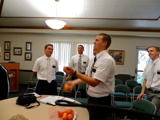 This is the way the sky looked almost all week. Even when there were clouds they did not produce any rain. On Tuesday we went to the Fort Lauderdale district meeting. It is one of the high points of our week as we get to share the spirit with the young missionaries. After the meeting elder Hall entertained us with some juggling of the tangerines we bought for a treat. Elders Rellaford, HoChing and Bloom look on. With winter coming on the birds that disappeared at the start of summer are showing up again.