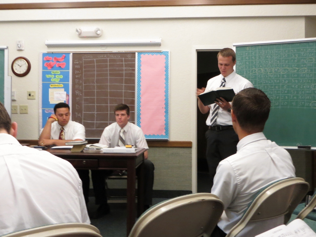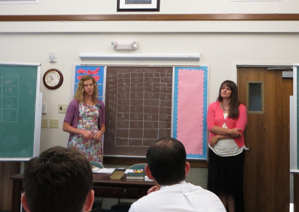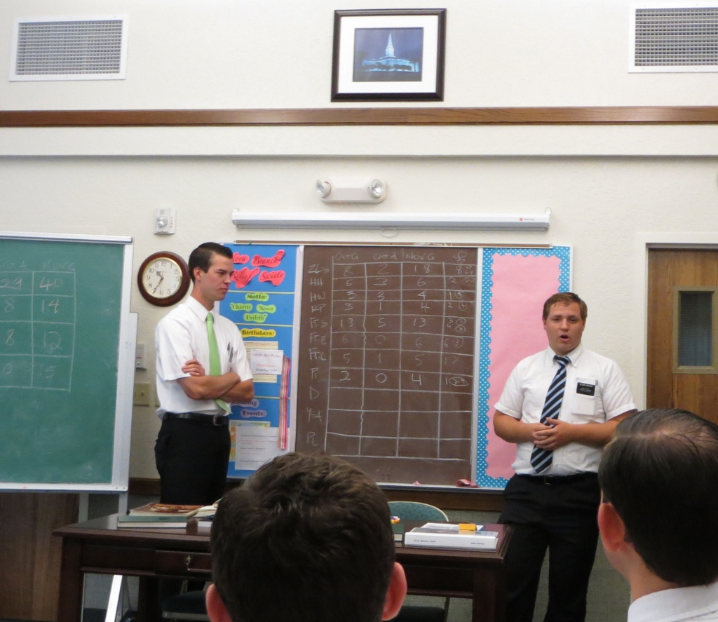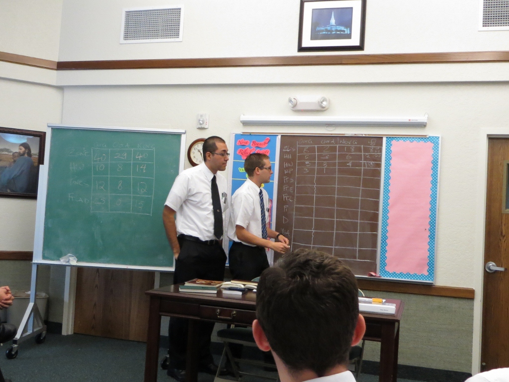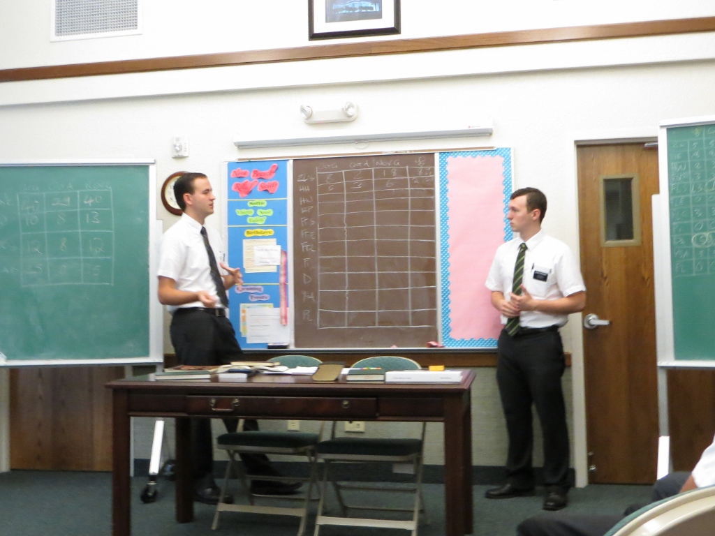 One part of Zone Meeting is that the companionships give an accounting for the month. Elders Brown and Marcusen, Sisters Stegelmeier and Dye – sister Dye will shoot me when she sees this picture – Elders Wood and Shaffer all give their reports.
