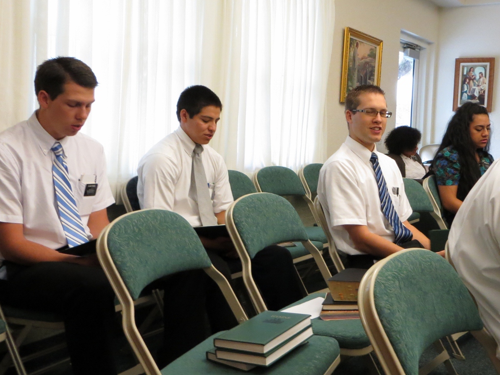 Part of the problem with traffic is that there is a huge expansion program on the 595 freeway. It was going on before we got here and will probably continue for well after we have left. Unfortunately it is a freeway that we use often. At Zone Meeting elder Hall was asked to lead the music – he does not know how to lead but bravely got up and gave it a try. Elders Rondo, Patino, and Maki as well as sisters Escorbores and Tuai join in singing.