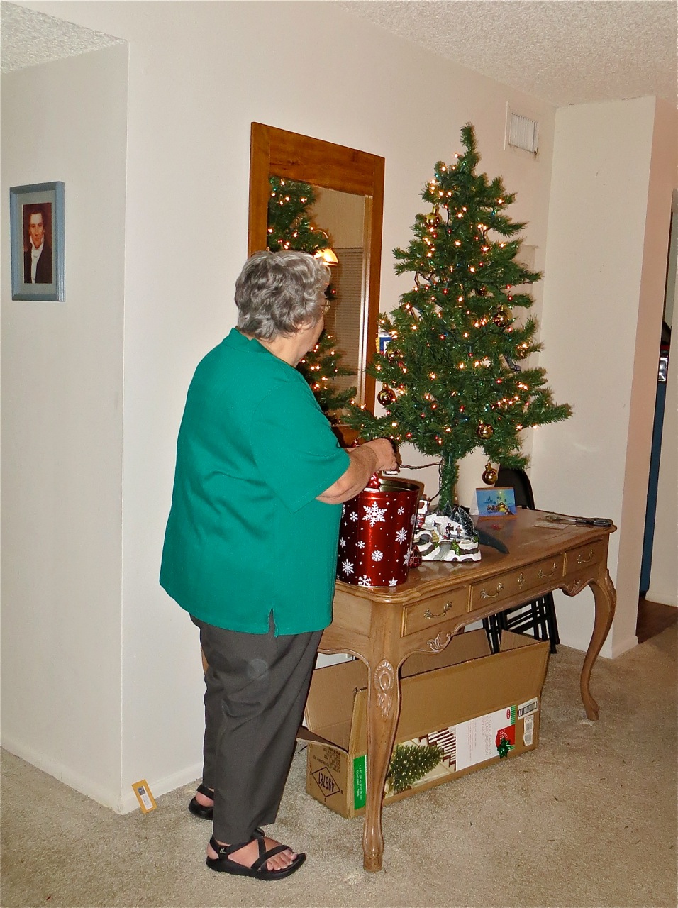 As usual I set up the tree, put on the lights and decorate the top of the tree – and take pictures. Mary got to do everything else.