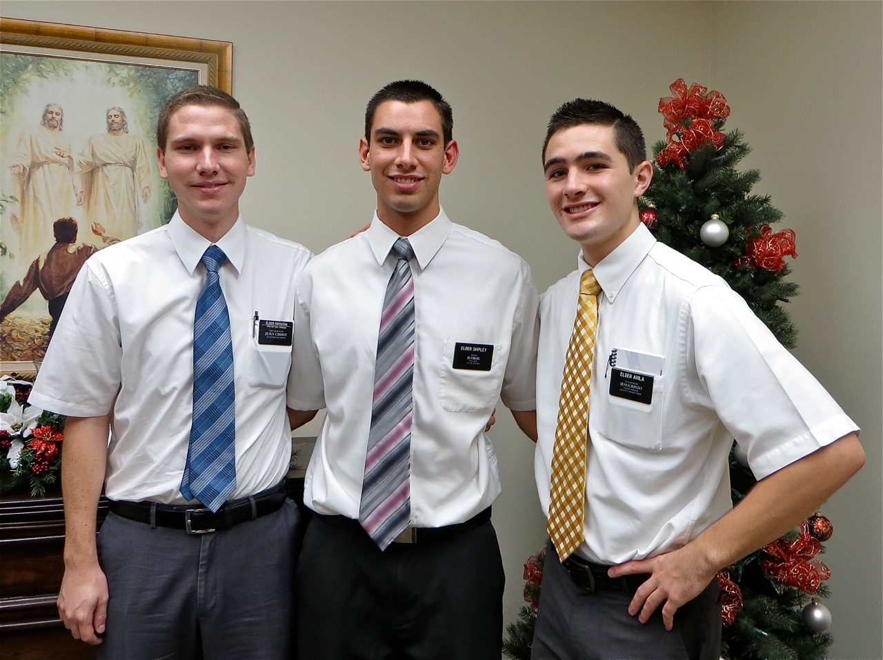 Yesterday the assistants were so busy that I never got a picture of them together. So this morning after they made it safely back to the office from the near disaster at the airport, I took this one of Elders Rippstein, Shipley and Avila. Elder Shipley is lucky to have the chance to be trained by the other two who are departing at the next transfer in January.