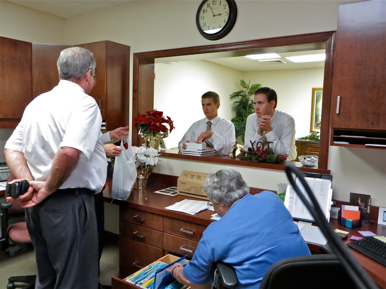 Elders Skousen and Williams are serving down in the Homestead zone. Elder Williams was trying to get his driver’s license renewed via the internet. He needs it to drive and to get on the airplane to go home in the future. Elders Edwards and Bjorling serve at the other end of the mission up in Stuart. Elders Plowman and Odar serve in the Palm Beach Zone…elder Bare and Mary were busy working while I took pictures.