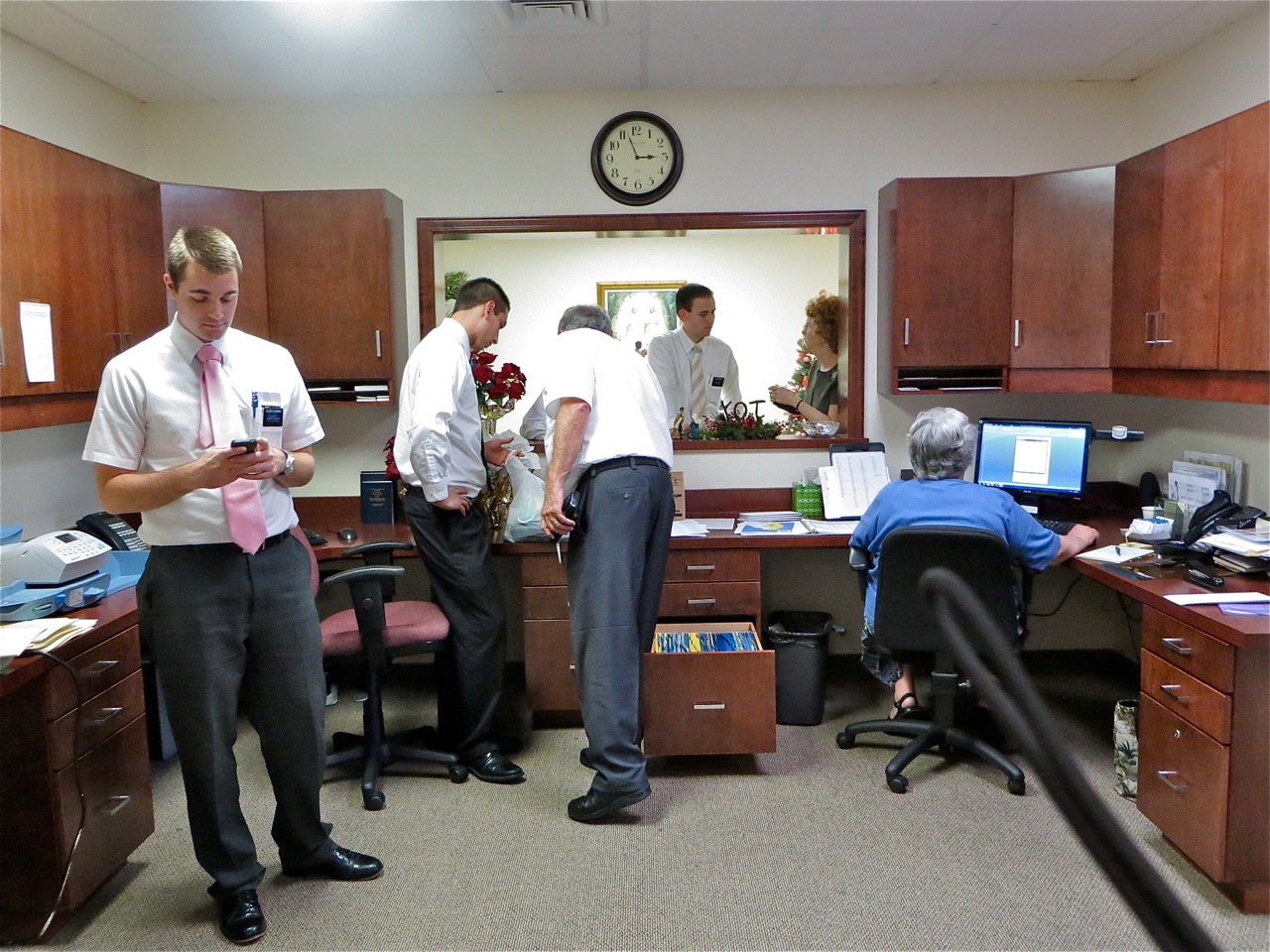 This has been an extra busy week because not only were there new missionaries, transfers, and departing missionaries that pretty much took up Tuesday through Thursday but today was Zone Leaders Council so after the meeting most of them stopped in at the office to pick up needed supplies and to take care of other matters.