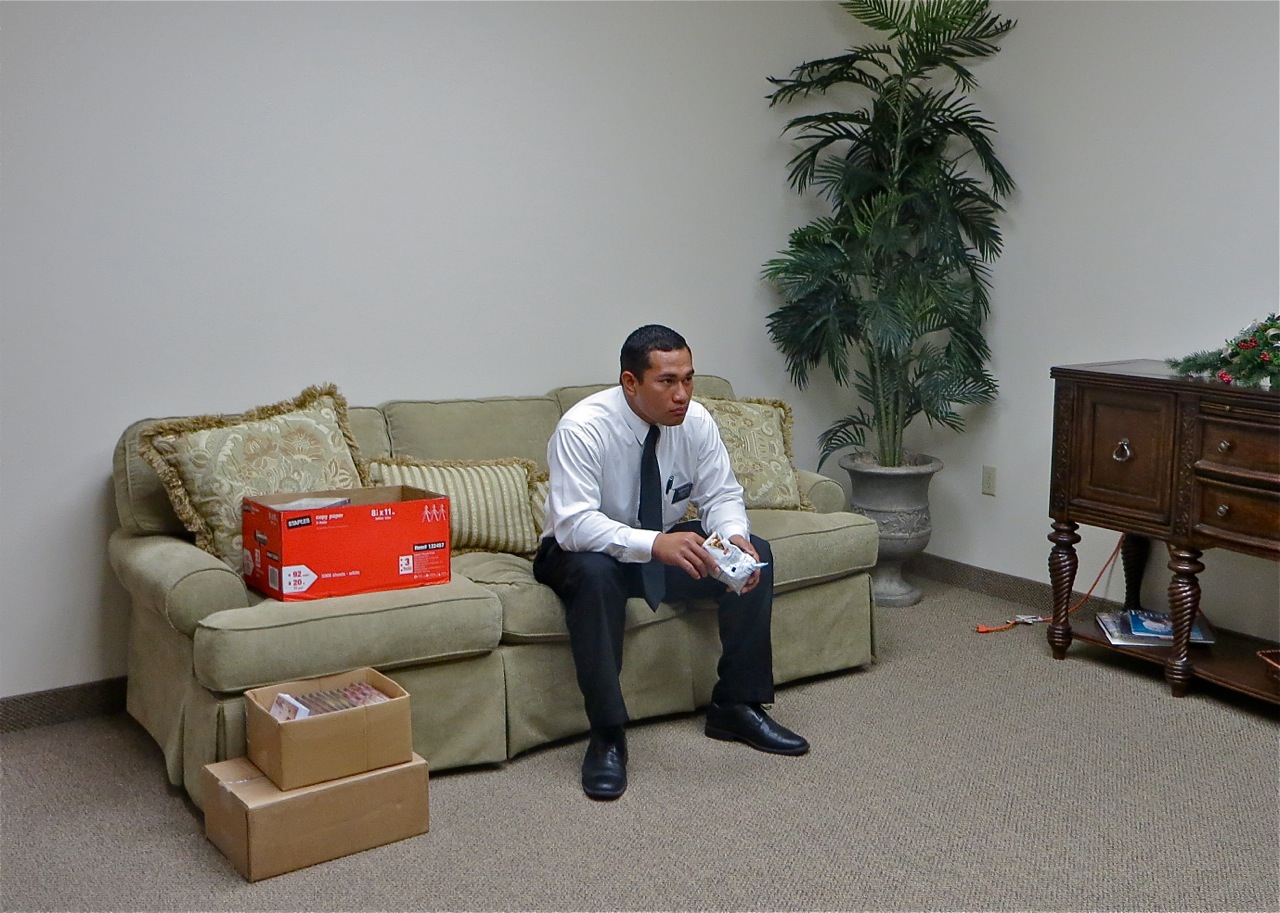 Lots of the missionaries want chapel cards to hand out. Sister Bare printed the cards almost to order and then the missionaries got to cut them out. I caught a sliver of sister Schneider, sisters Carnes, Brown and of course Mary who was slaving away over a hot computer. Elder Allen and Kata are serving in Blue Lagoon when not striking poses for the camera. Later I caught elder Kata eating a bag of SunChips to build up his energy so he could carry out the big load of supplies next to him.