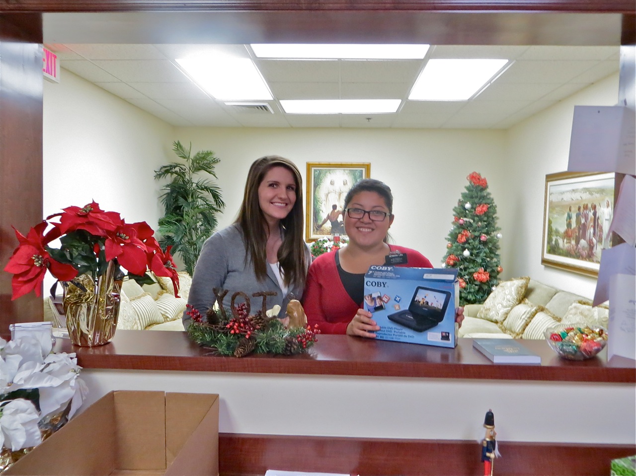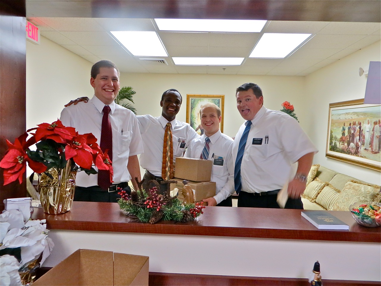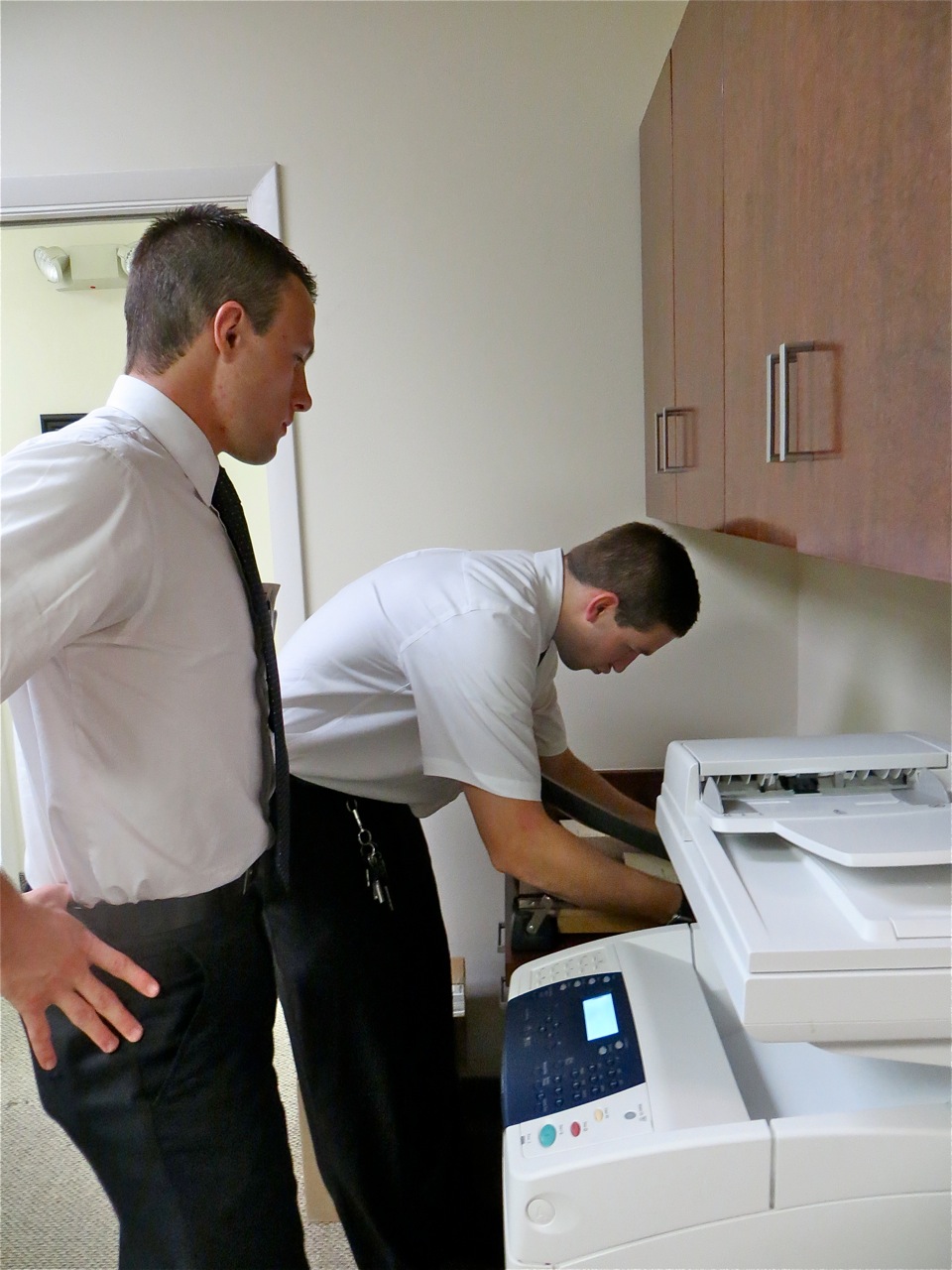 Sisters Schneider and Lira brought in their broken DVD player. Unfortunately they are going to have to wait for a new one because they are on order. About 2 hours after I took this picture, sister Schneider’s mother called to try and track down a package that seems to be stuck somewhere in the system. Since our sister Schneider had asked the same question I already knew the answers. Â Elders Duncan, Rasmussen and Bowen at the big board. Sister Brown is looking at some pictures that are posted.