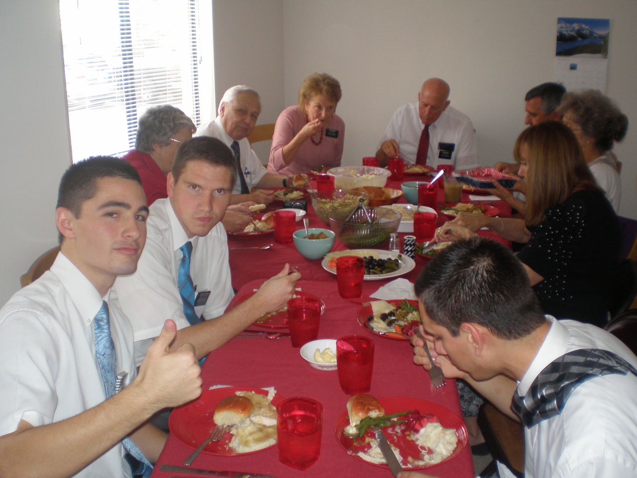 Elder Evans took the best picture of the Christmas lunch enjoyed by four couples – Us, Boices, Sommerfeldt and Evans as well as the Assistants – Elders Avila with his signature  thumbs up, Rippstein who seems to have almost cleaned his plate, and Shipley who is not going to let anything distract him from enjoying the great meal the sisters prepared.