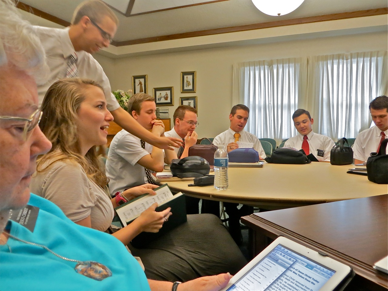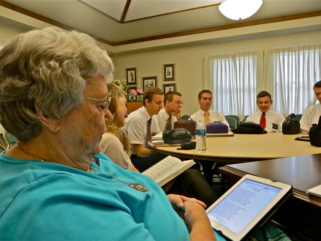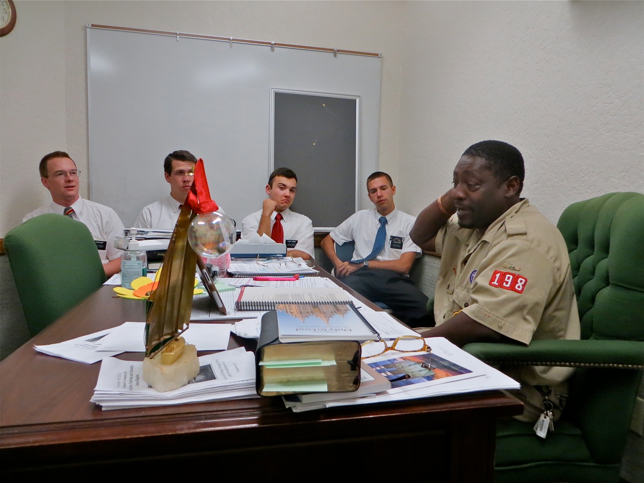Even when they are in the office, they keep busy with their investigators. Here sister Stegelmeier makes an important call. I even caught the companionship together. In the evening we went back to the Fort Lauderdale chapel for the Ward Missionary Correlation meeting. Bishop Brown says that he wears his Scout uniform so he does not have to wear a white shirt and tie. It is a lively meeting but there are not many potential baptisms this week.