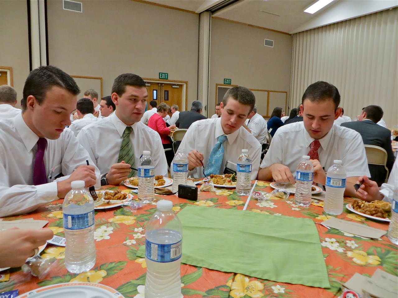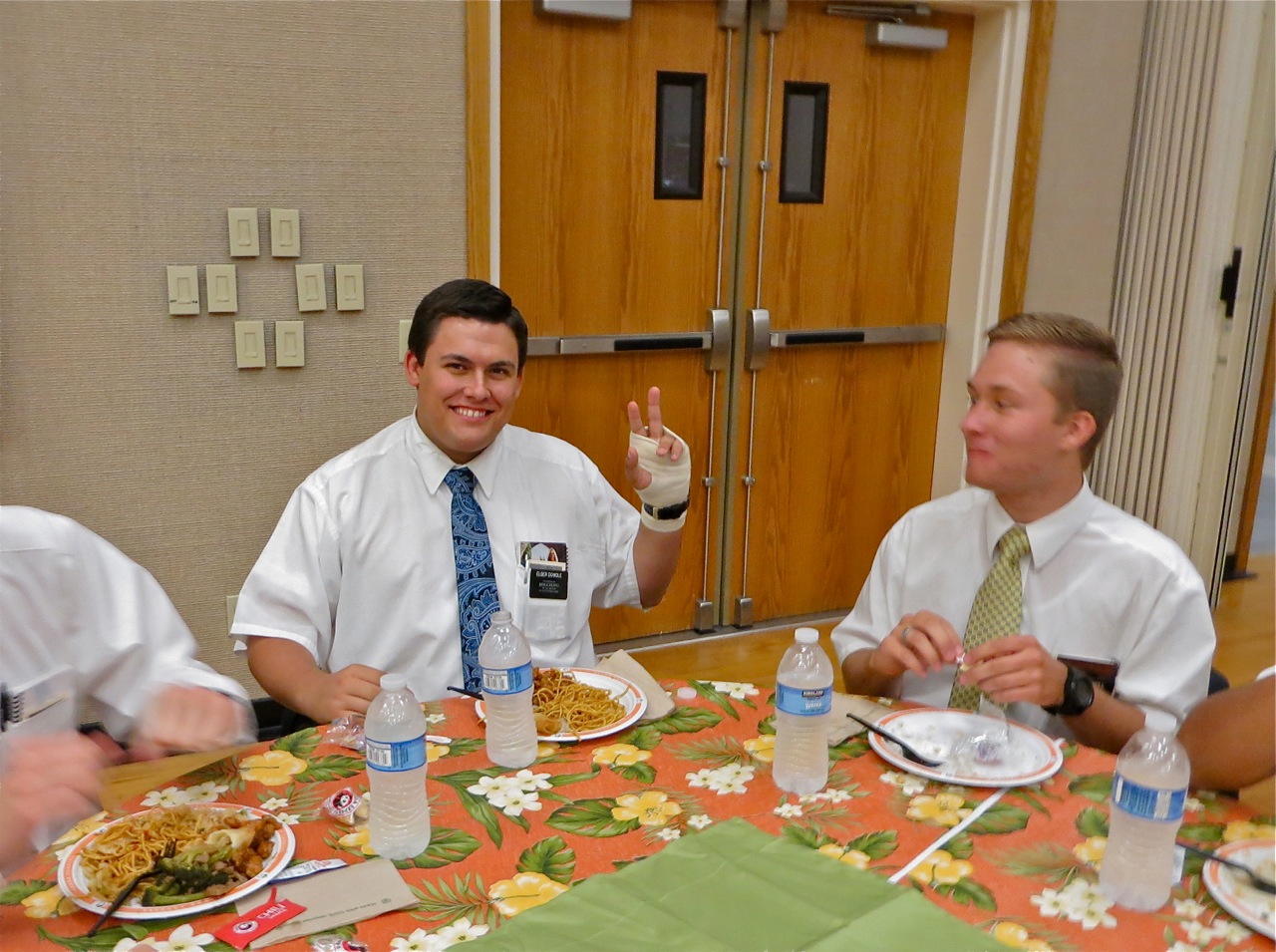 Elder Brown were at a table with elders Fullmer and Koerper – the companions who serve at the end of the world and mission down in Key West. Elder Dowdle was willing to show off his hand that required 10 stitches when he accidentally cut himself with a machete. He was cleaning it when it went off?
