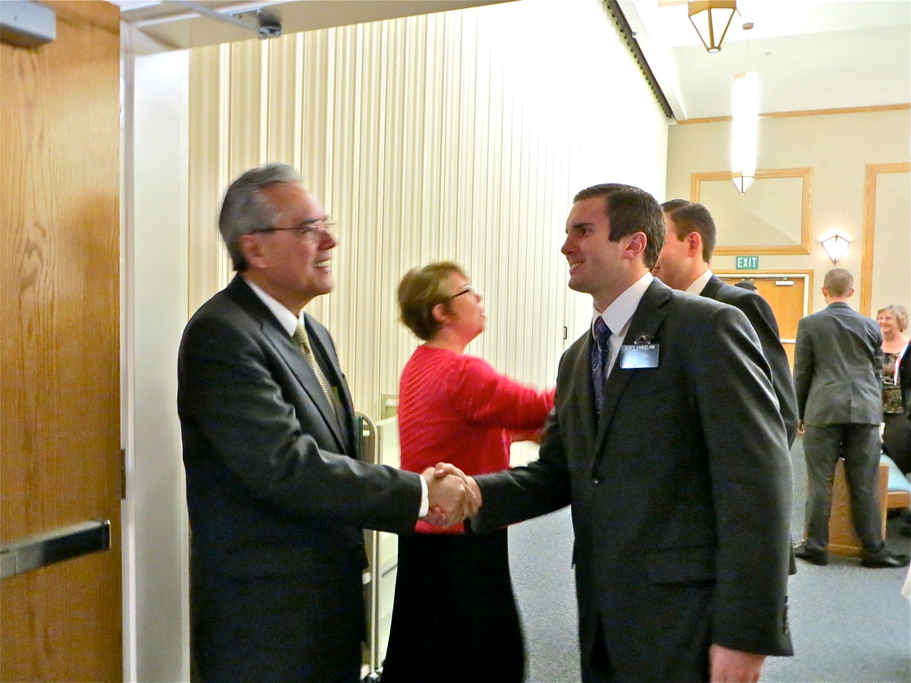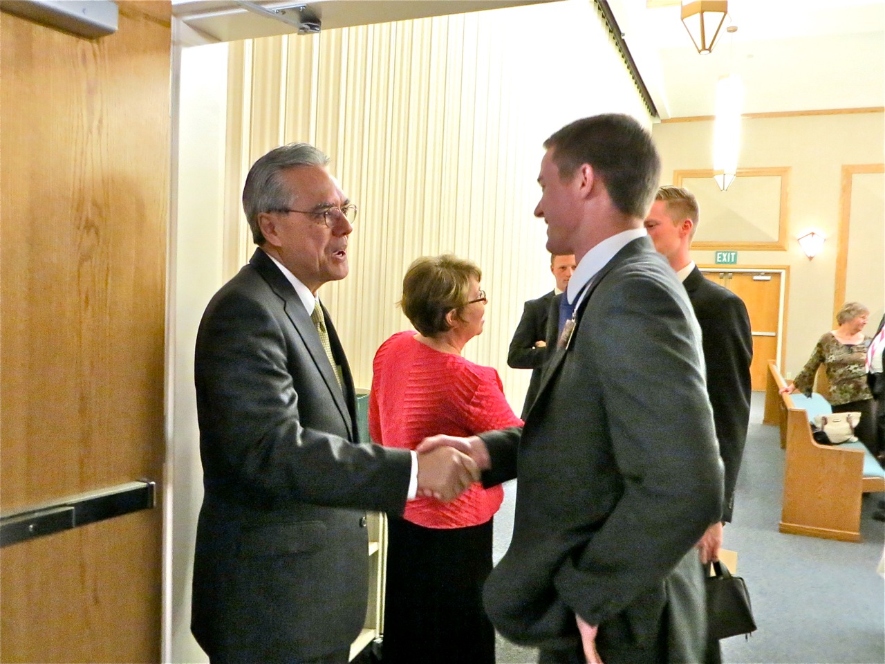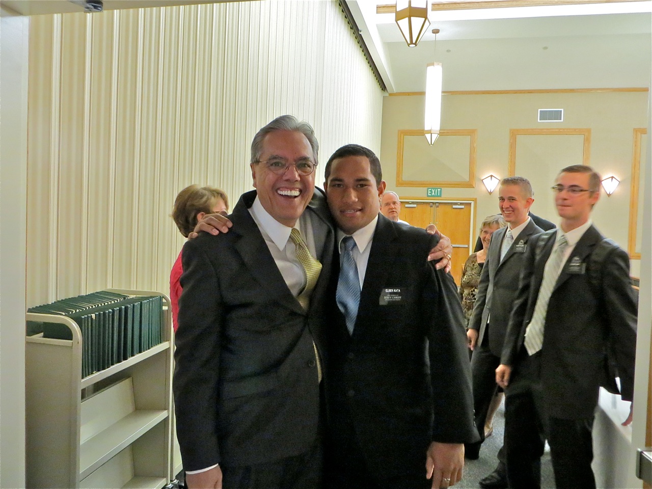 I never did get to shake their hands but later I did have a chance to talk to Elder Haleck about when he was mission president in Samoa. During their 3 years of service the mission had about 5000 baptisms and re-activated about the same number. The mission raised sacrament meeting attendance so high that 3 or 4 new stakes had to be formed. Of course he has a special place in his heart for missionaries as he did not join the Church until he was 17.
