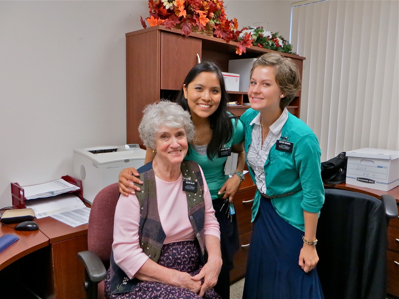 The Halecks had their picture taken with elder Toeava who comes to us from Samoa. I am sure they know a lot of the same people. We got most of the sisters together for a picture. What a group of amazing women and missionaries. When we got back to the office, sisters Holyan and Dougal dropped in so I got a final picture of the day of them with sister Ellis who was doing the mail.