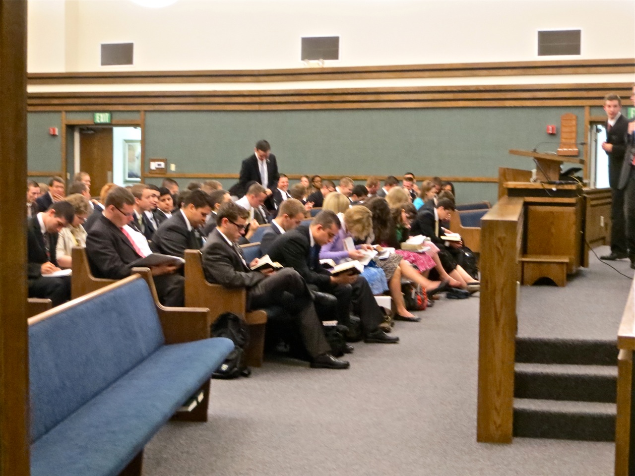Being very obedient missionaries, most of them were in the chapel soon after 8:00 and studying their scriptures. The front two rows were filled with the 21 new missionaries who probably are still trying to recover from jet lag and waking up yesterday – if they ever went to sleep that is – in time to catch the bus to the SL airport at 4:30. Elder Bay and Tesch who are down in Homestead Zone were one of the companionships that stayed the same but they still came up to bring other missionaries. They sat on the back row and had a great view of the meeting.