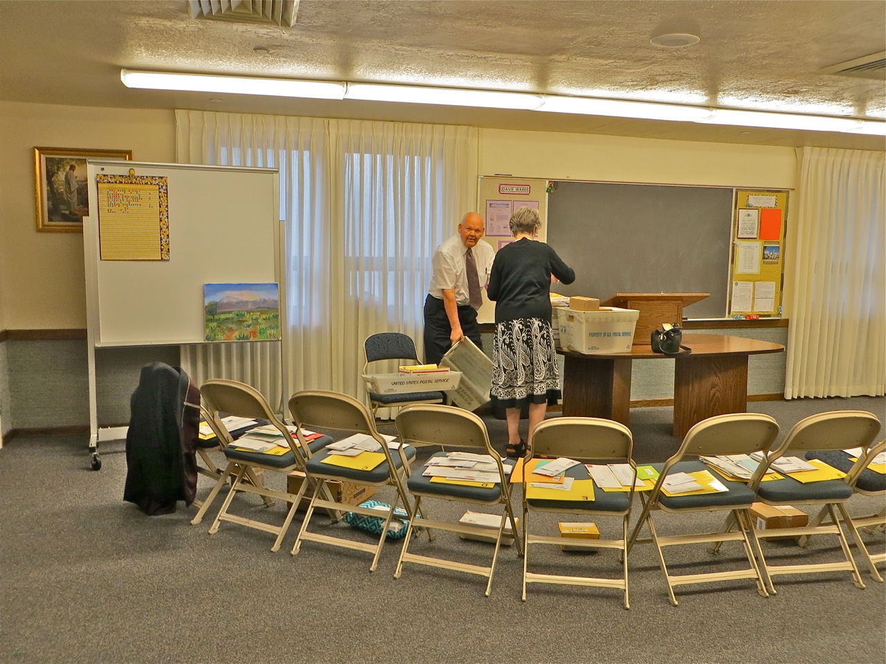 Elders Elliott and Loucks have been companions but they also got new companions. One of the things that missionaries look forward to is getting mail. Since a good portion of the missionaries move each transfer we hold letters and packages or about a week before transfer meeting so it does not get sent to the wrong address. E/S Ellis carefully lays out the mail on hand so the missionaries can stop in and get their’s after the meeting.