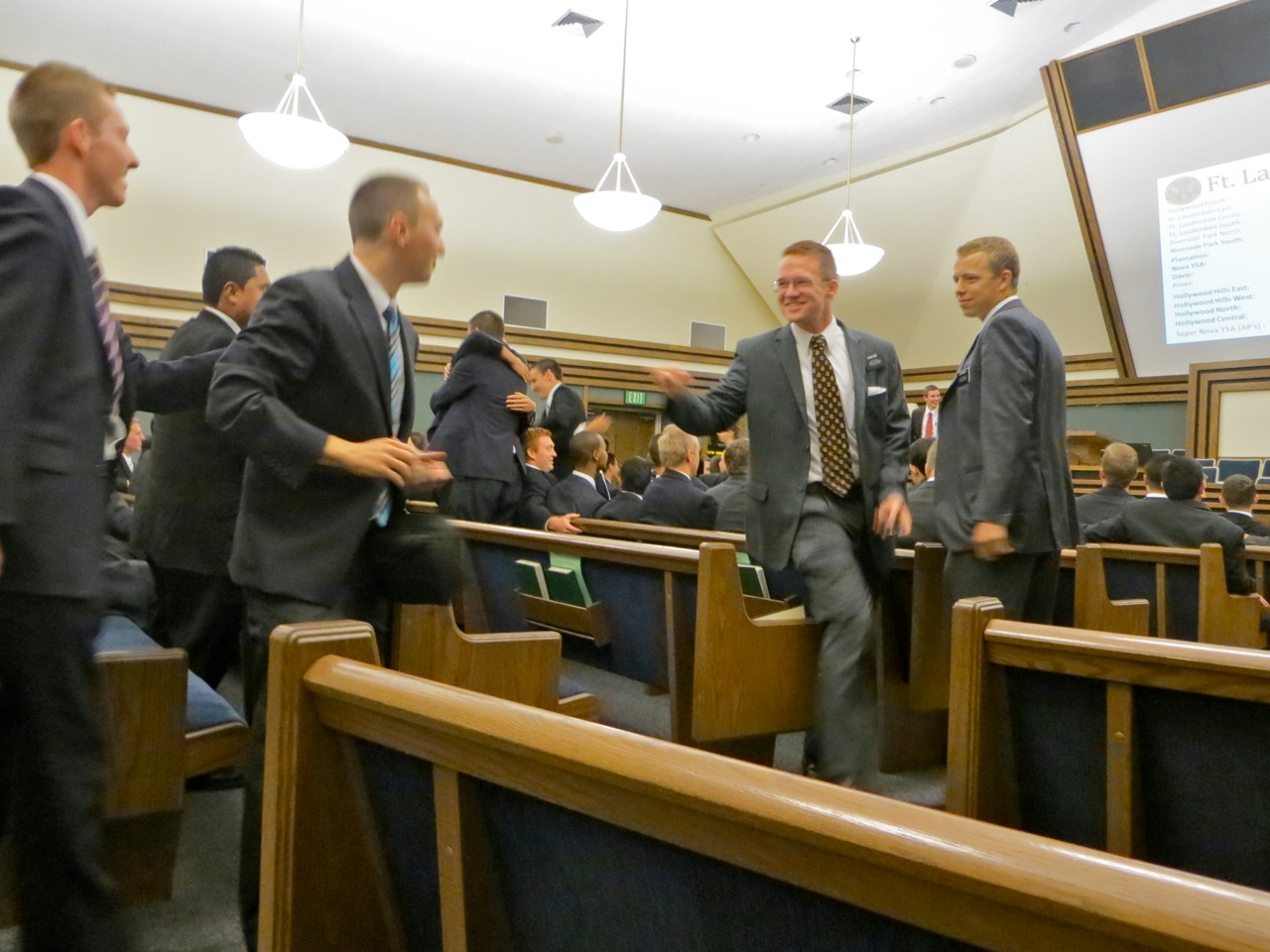 I mentioned above the changing of companionships that occurs zone by zone. Once the assignments are read they tend to jump up, give their old companion a big loving hug and immediately find their new companion and greet them the same way. They then sit down in the zone that they are assigned. My short term friend and companion for about 20 minutes, elder Mendenhall will be trained by elder O’Neill in the Miami Beach Zone. I am sorry that I will not get to know elder Mendenhall better but I know he will be well trained by elder O’Neill.