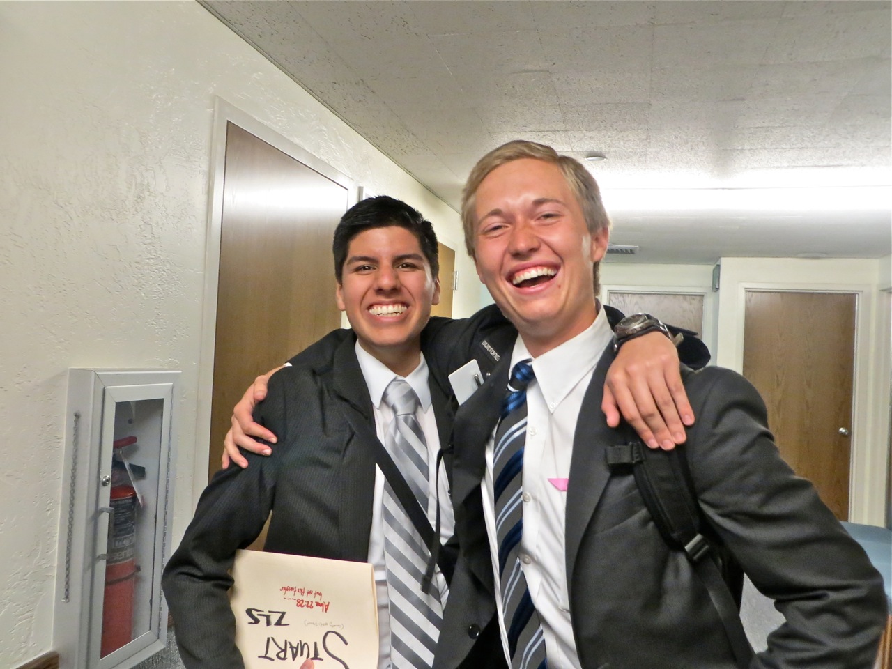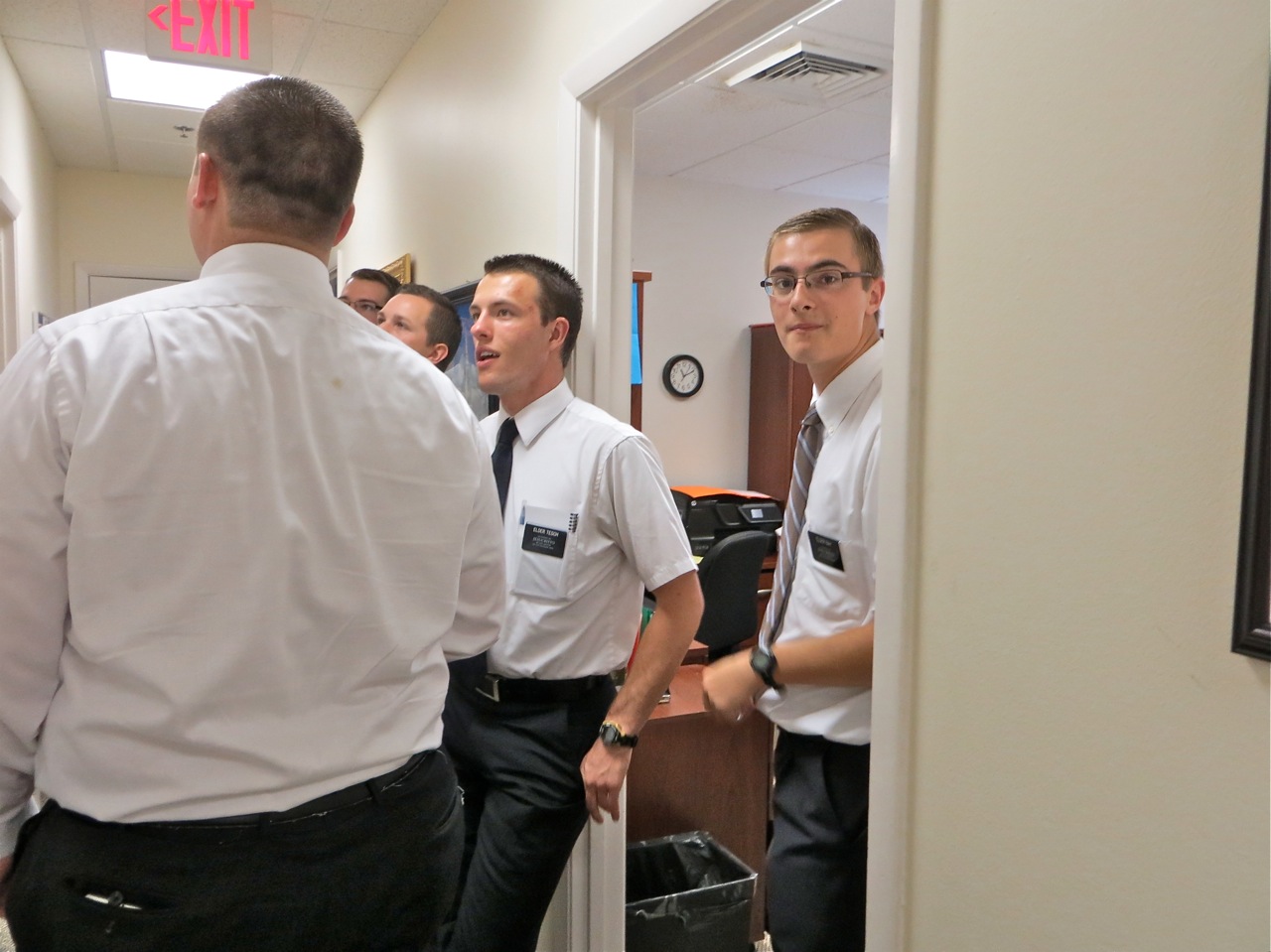 All the missionaries involved in the transfer was asked to be at the chapel by 8:00 so they could spend some time studying and pondering the scriptures. I did catch a picture of elders Jones and Hunt in the hall. They had been serving as ZLs up in Coral Springs but both left the meeting with new companions and positions. Elder Richardson is on the end of the group of missionaries intent on studying.