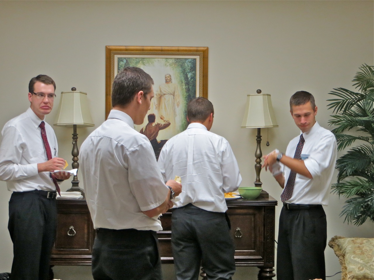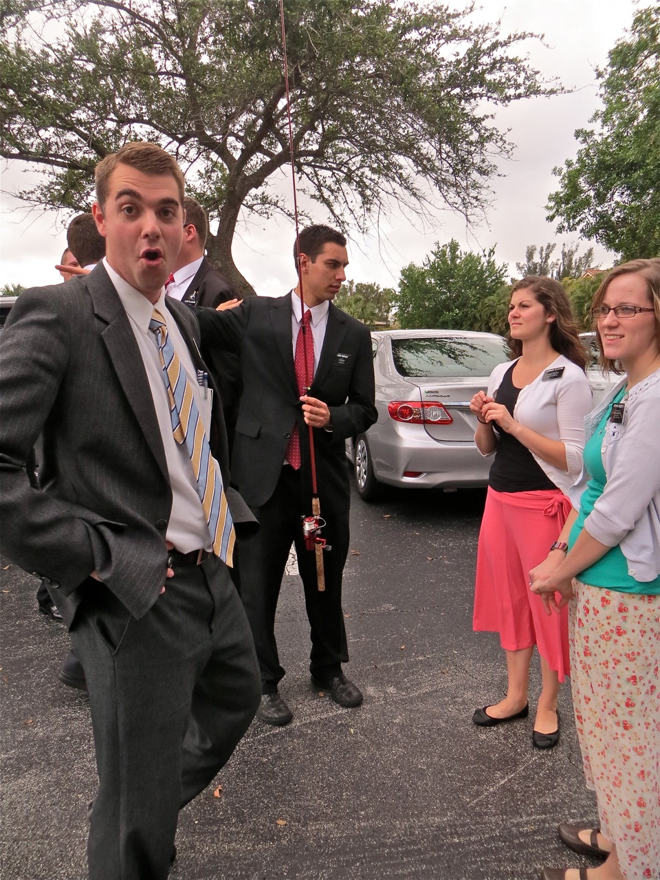 Elder Plowman clowns around while elder Shipley explains to sisters Clayton and Moody how to use a fishing pole to become fishers of men…anyway that is how I interpret this picture. Elder Claude and elder Jones just happened to be close to each other so I took their picture.