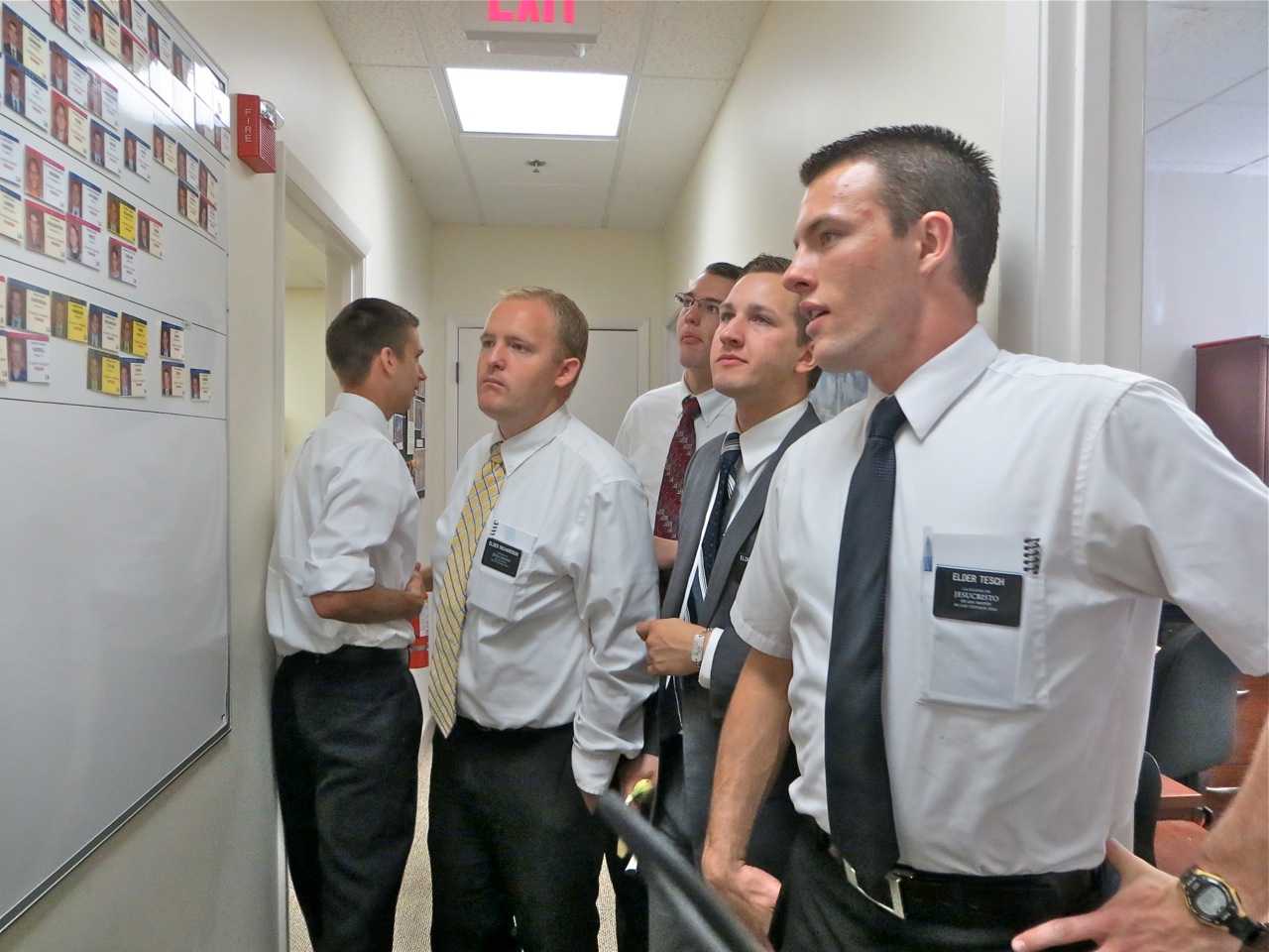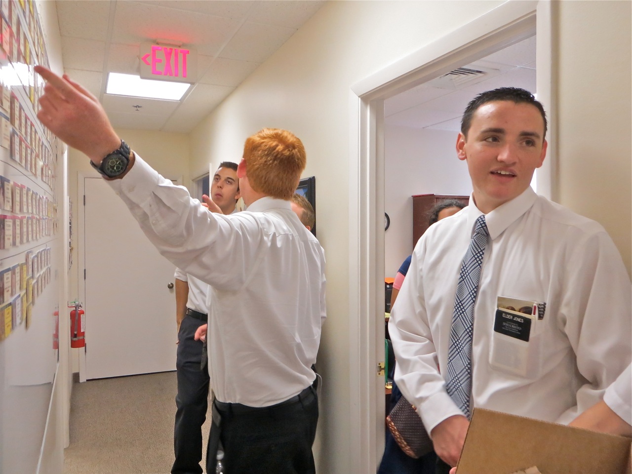After they leave the chapel many of the missionaries stop in at the office to pick up supplies. They almost all stop in the hall to see where they and their friends are on the big board. Elder Bay seems to have more interest in my taking his picture than elder Tesch and others. In the right hand picture I caught elder Richardson, Tesch and others looking at the board.