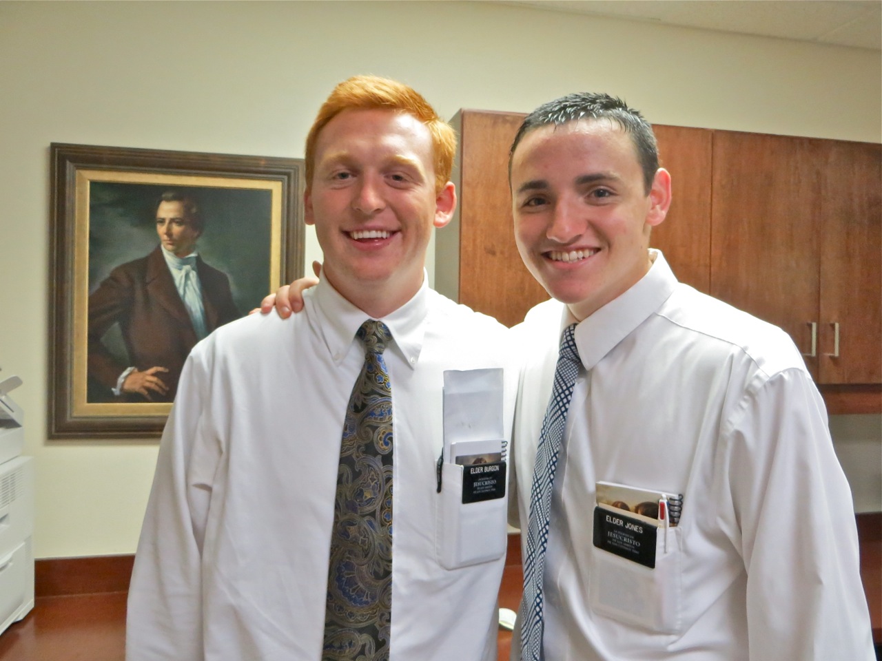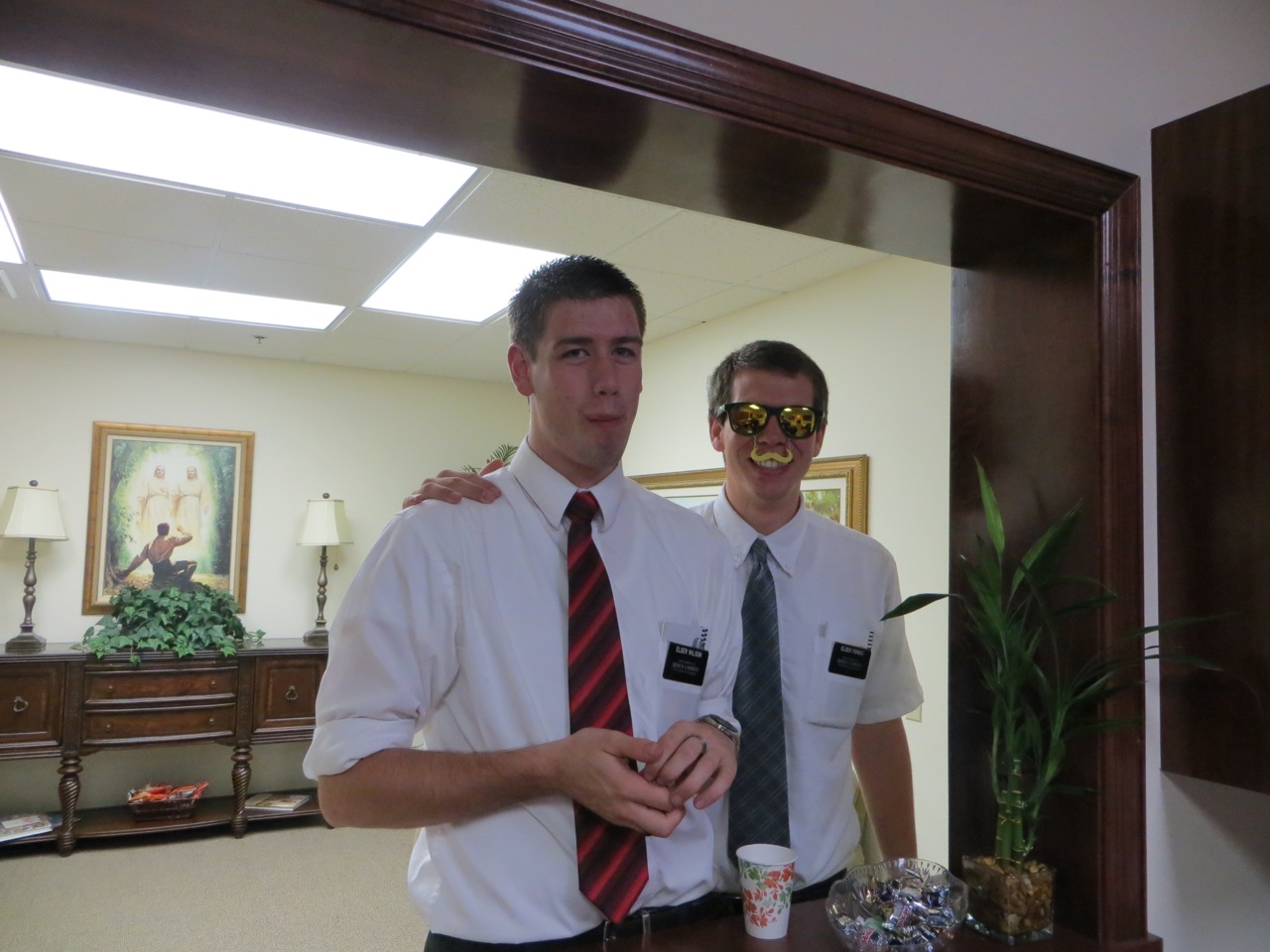 One of the reasons that the missionaries love to come into the office is that sister Bare feeds them bananas, pastries, cheese with crackers and lots of snacks. Elders Burgon and Jones , the two zone leaders in the Coral Spring zone got in a picture.